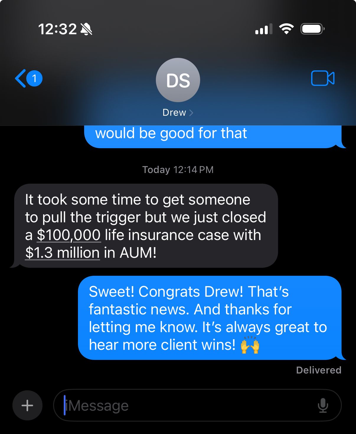 Shortly after recording the video, Drew closed his first client from the campaign (see image below) with $1.3 Million in assets under management.